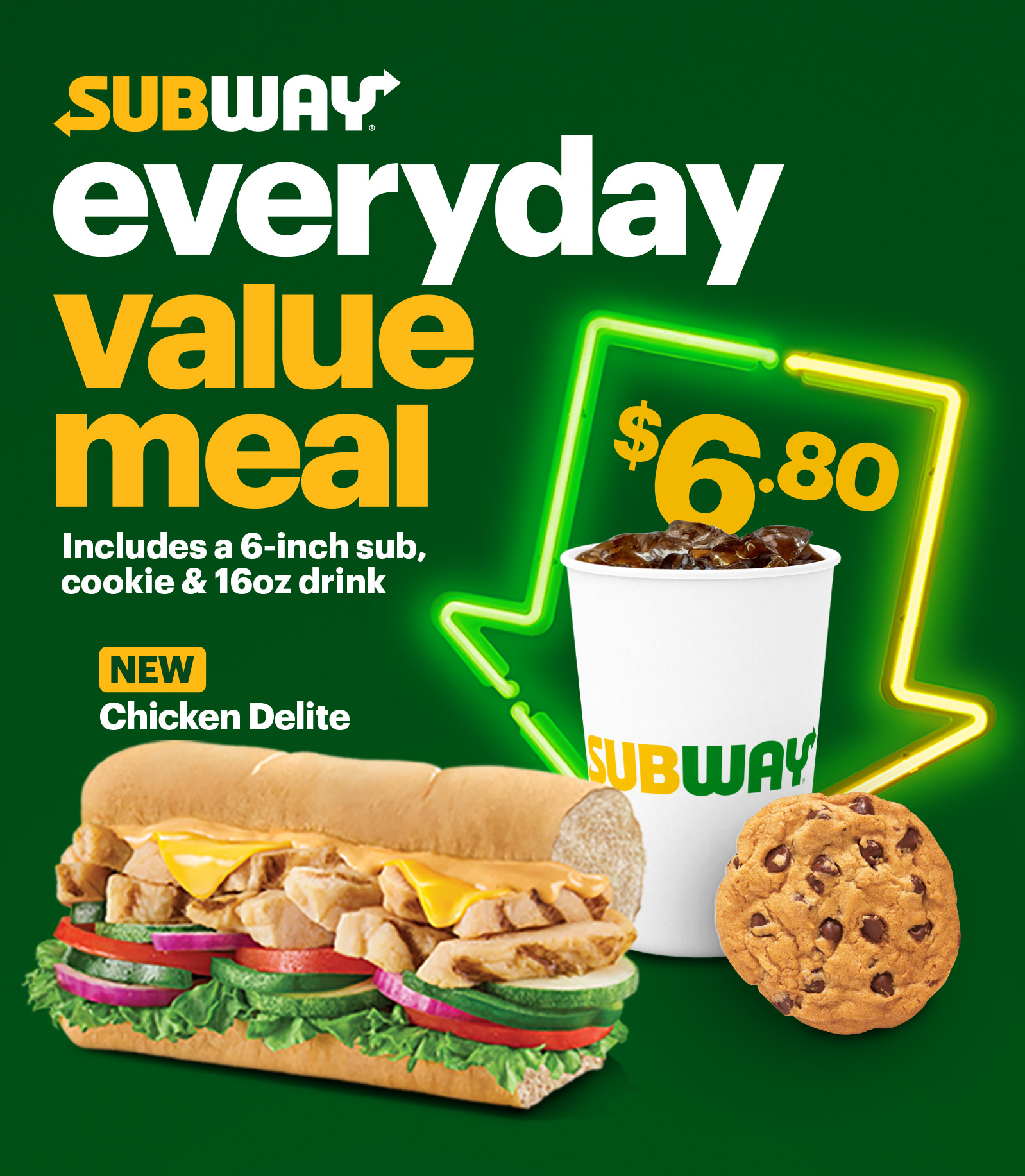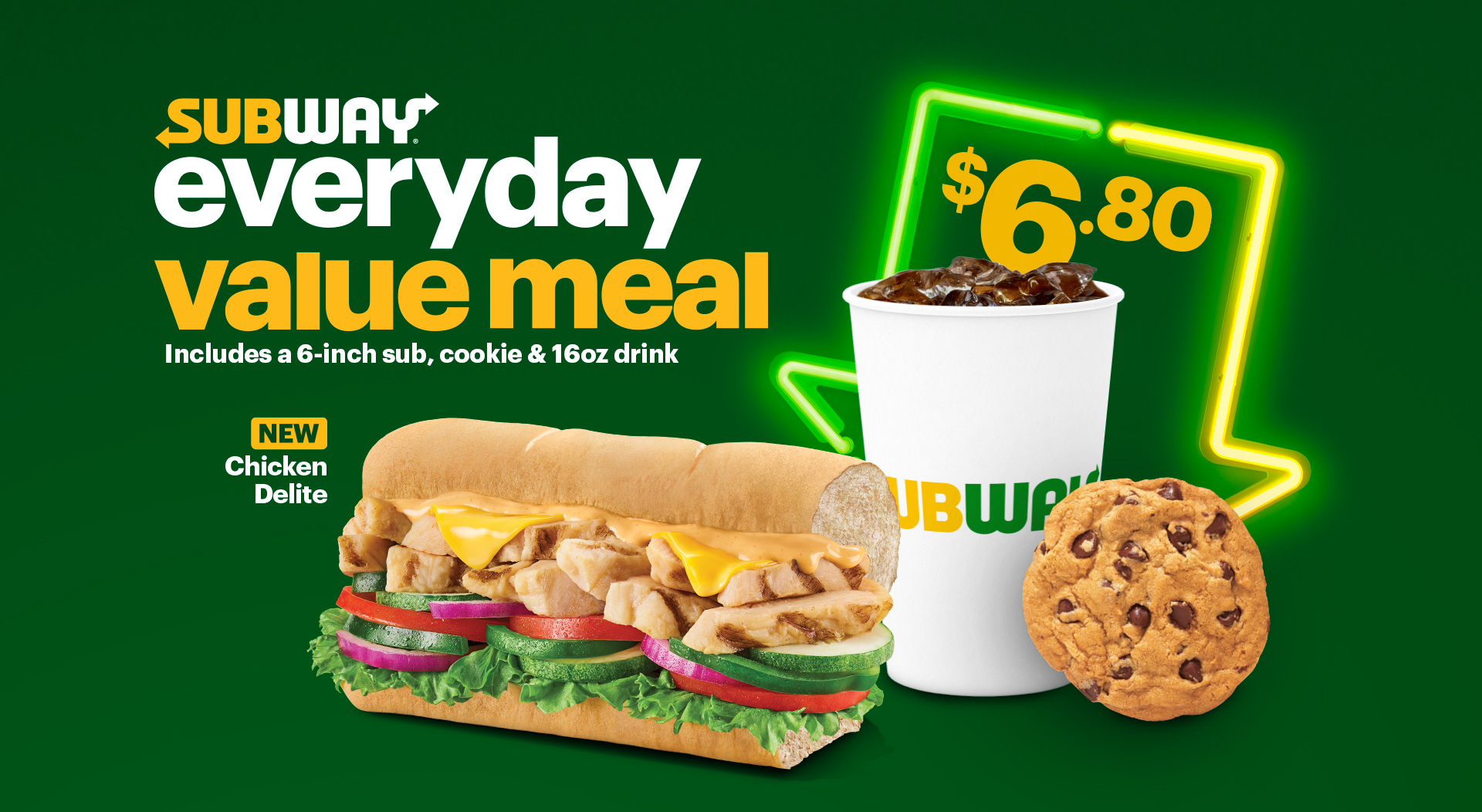 A 6-inch sub of your choice, a cookie and a 16oz drink, all for a deal-licious $6.80. Eat fresh, feel good and fuel good — now that’s what we call an everyday win!